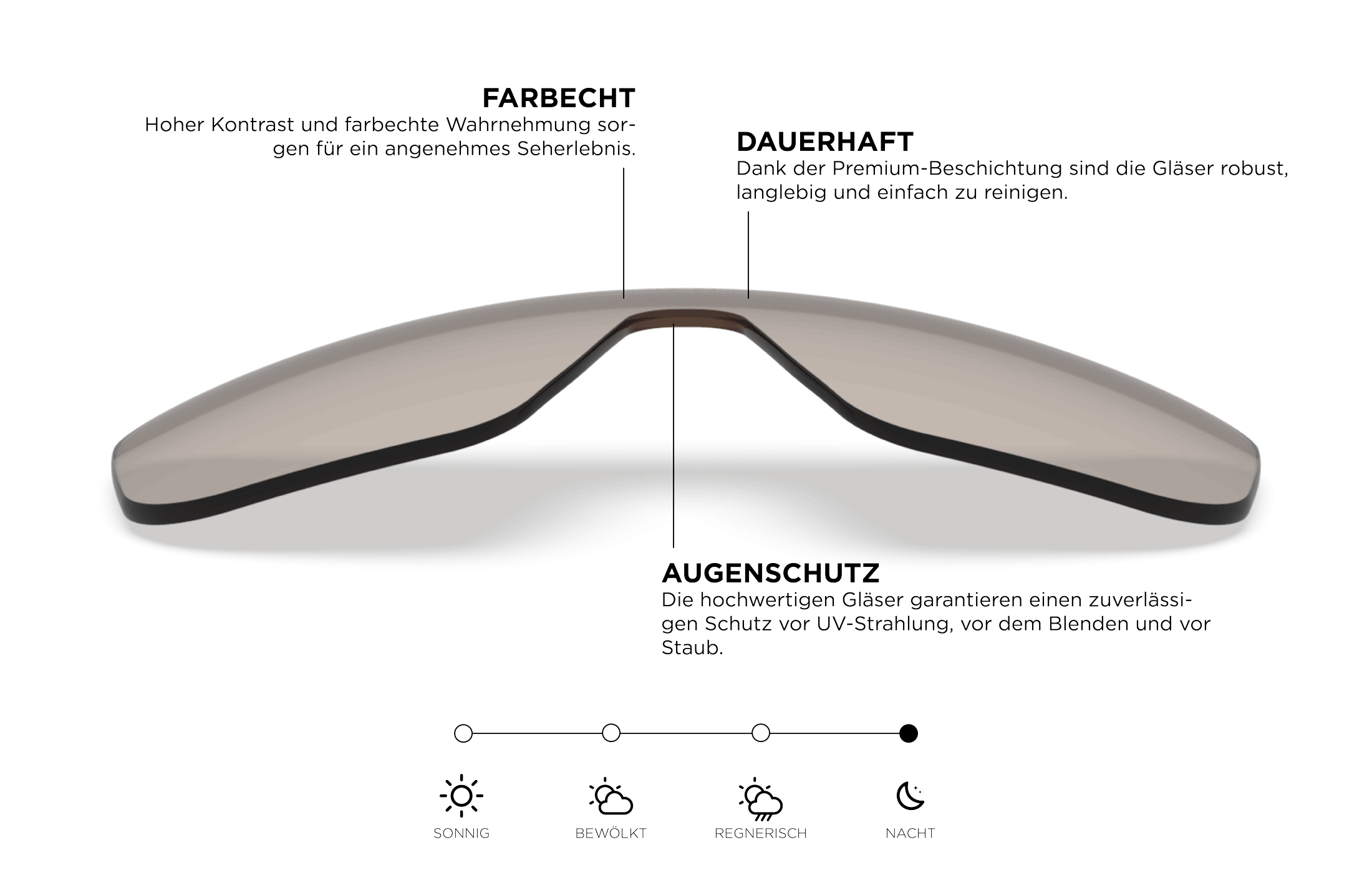Das photochromatische Glas passen sich automatisch den Wetter- und Lichtverhältnissen an. Die Tönung variiert von Kategorie 1 bis Kategorie 3 und ist somit auch für Fahrten in der Dämmerung und in der Nacht geeignet.