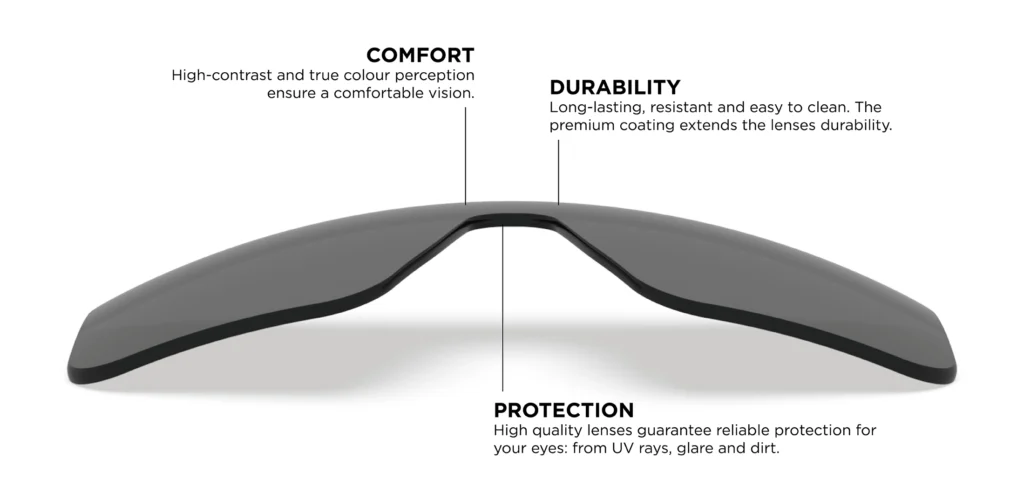 The VIBRANT GREY lenses are developed to provide a high-contrast visual experience in a range of sunny and cloudy lighting conditions. It’s highly durable and impact resistant. The lenses increase depth perception to see more detail: whether bumps on the road or the beautiful surroundings you’re cycling in.