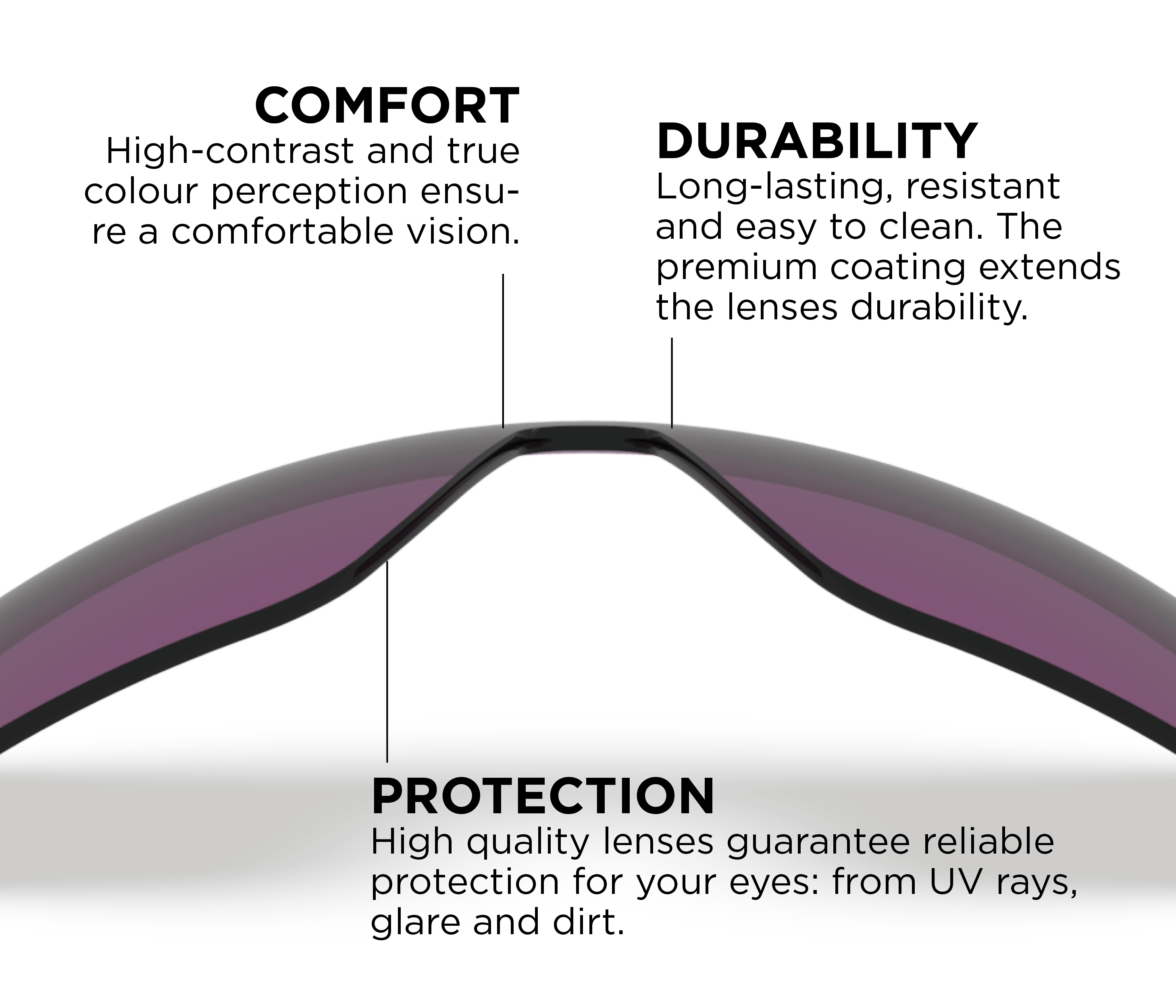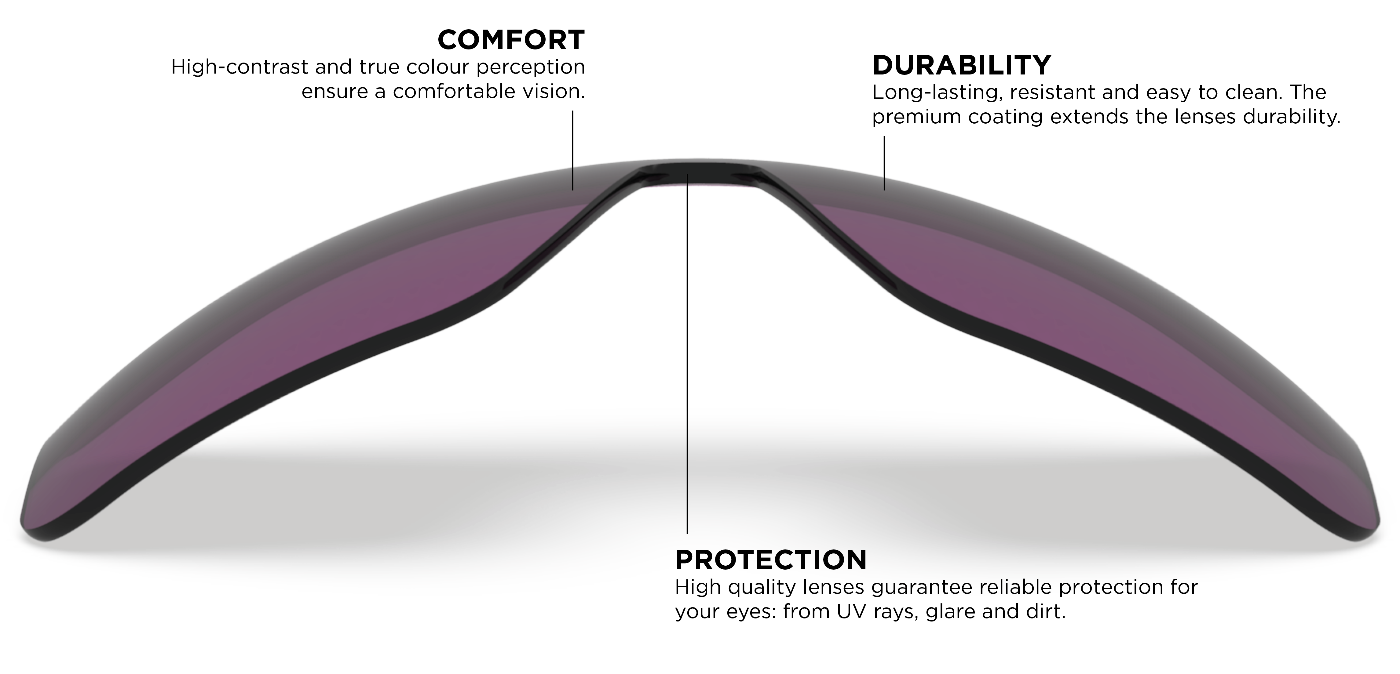 The vibrant violet lenses are developed to provide a true-colour and high-contrast visual experience in a wide range of light conditions. They improve depth perception enabling you to see more detail and to give you the best experience on your ride.
